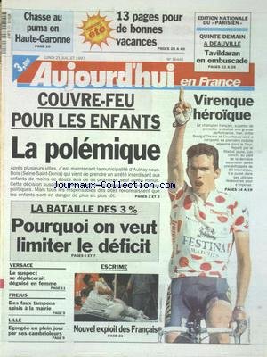 AUJOURD'HUI EN FRANCE [No 16445] du 21/07/1997 - COUVRE-FEU POUR LES ENFANTS - LA POLEMIQUE - LA BATAILLE DES 3 POUR 100 - POURQUOI ON VEUT LIMITER LE DEFICIT - VERSACE - LE SUSPECT SE DEPLACERAIT DEGUISE EN FEMME - FREJUS - DE FAUX TAMPONS SAISIS A LA MAIRIE - LILLE - EGORGEE EN PLEIN JOUR PAR SES CAMBRIOLEURS - LES SPORTS - LE TOUR DE FRANCE ET VIRENQUE - ESCRIME